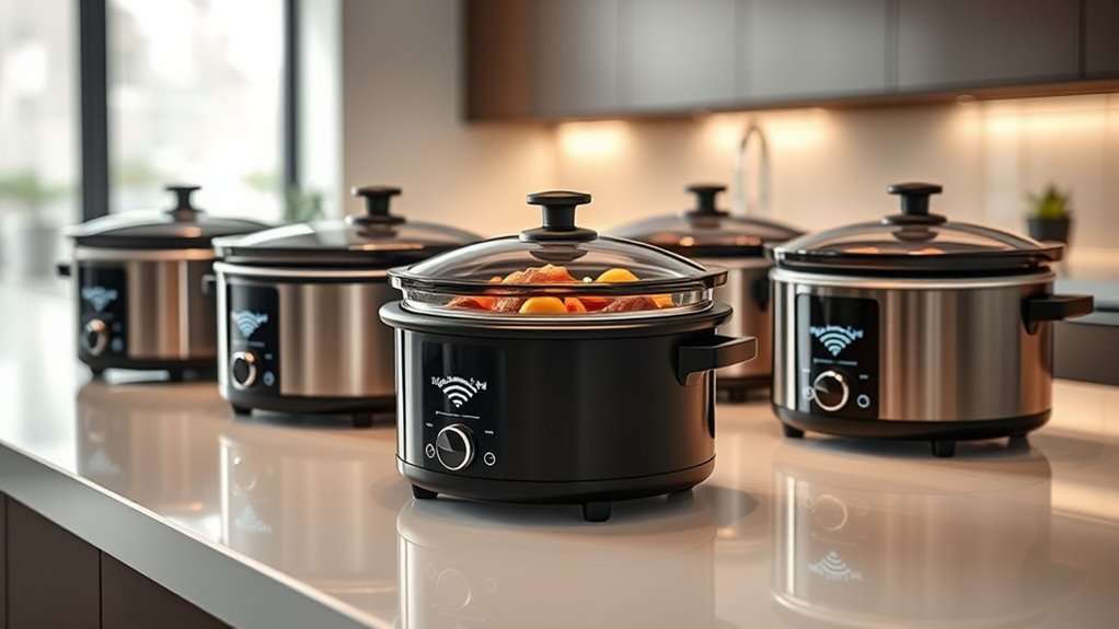 Have you ever wished you could check on your slow cooker or adjust its settings from anywhere? Wi-Fi connectivity makes that possible, offering remote control and real-time updates through smartphone apps. You can monitor cooking progress, receive customizable alerts, and get notifications when your meal is ready, all from your phone or tablet. Plus, many models integrate seamlessly with smart home systems and voice assistants like Alexa or Google Assistant, enabling hands-free operation. Firmware updates over Wi-Fi guarantee your cooker stays current with new features and performance improvements without needing manual upgrades. Some devices even support multiple user profiles and sharing options, making it easy for family members to access and coordinate meal prep. Connectivity features make slow cooking more flexible and convenient than ever before.