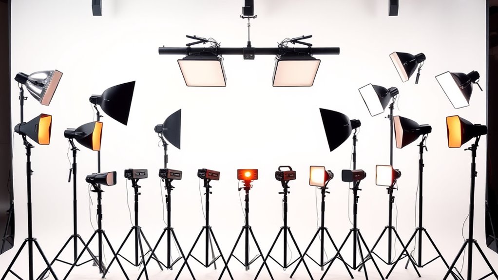 Choosing a studio lighting kit that’s compatible with a wide range of accessories is vital for expanding your creative options. I look for kits with standard mounting interfaces, like 1/4-inch or Bowens mounts, to guarantee compatibility with softboxes, reflectors, and diffusers. It’s important to verify that power connectors and sockets match my existing equipment so I don’t need adapters. I also check if the light stands support accessories like boom arms or backdrop holders for versatile setups. Compatibility with remote controls or dimming features is essential, especially if I want seamless control through apps or protocols. Finally, I consider whether the kit supports professional accessories such as grid attachments or snoots, allowing me to experiment with more advanced lighting techniques.