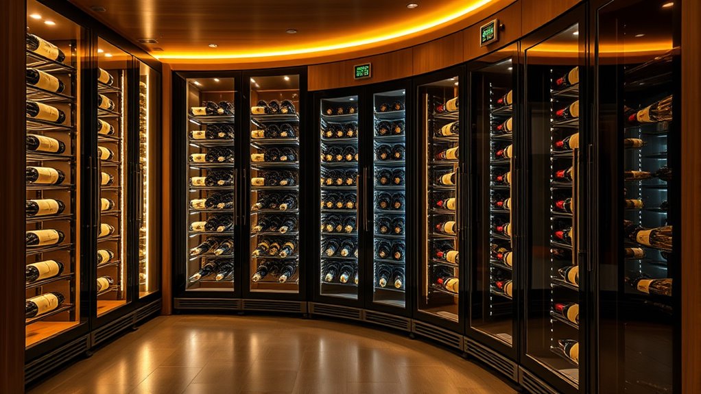 Think of my high-end wine fridge like a fortress for my collection. It includes security features like lockable doors, tamper alarms, and discreet lock codes, ensuring my wines stay safe. Some models even have fingerprint access for added security. These features give me peace of mind, knowing my prized bottles are protected from theft or unauthorized access, just like a fortress guards its treasures.