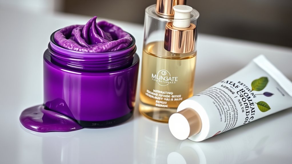 Choosing the right product to repair dry, damaged hair depends on carefully considering its ingredients. Look for formulas with keratin, biotin, or amino acids, as these strengthen and rebuild weakened hair fibers. Ingredients like coconut oil and marine collagen penetrate deeply, providing hydration and boosting elasticity. Products containing bio-proteins or protein builders help refill and reinforce fragile strands. Natural oils and extracts, such as Mafura oil or manuka honey, restore moisture and reduce frizz, supporting overall repair. It’s equally important to avoid harsh additives like sulfates, parabens, or alcohols, which can strip moisture and worsen damage. By focusing on nourishing, strengthening, and hydrating ingredients, you’ll select products that effectively combat dryness and promote healthier hair over time.