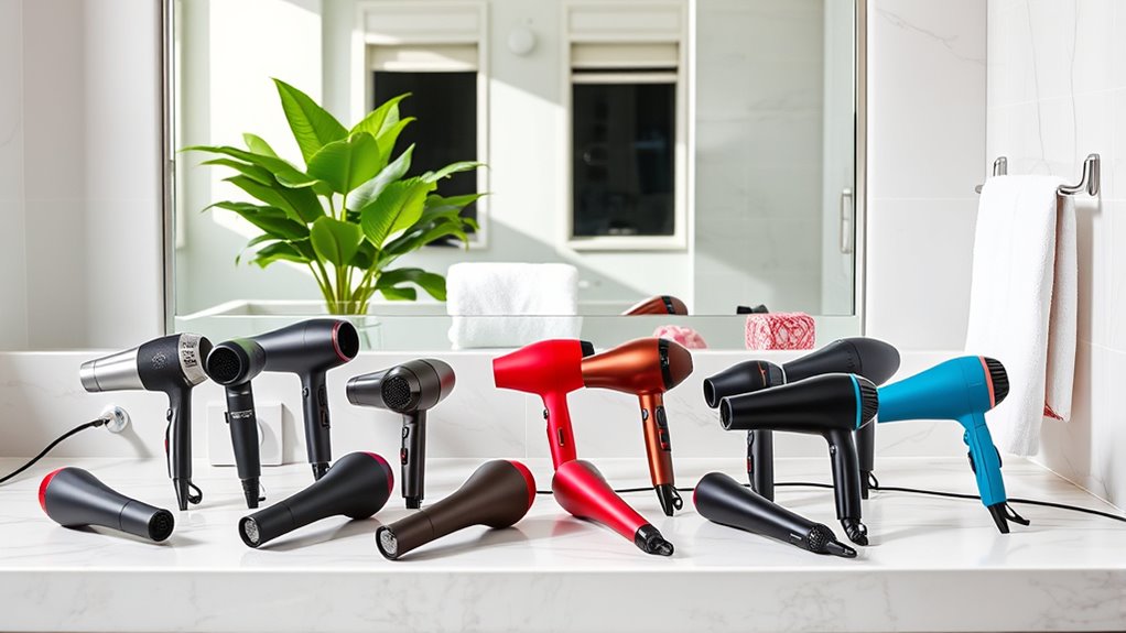 Choosing the right motor power and efficiency is essential for anyone looking to invest in a professional hair dryer. I’ve found that higher wattage motors, like 1875W or above, deliver stronger airflow and faster drying times, making them perfect for salon-quality results. If you have thick or long hair, a powerful motor with high RPM can really speed up the drying process. I also recommend considering the motor type—AC motors usually offer better durability and more power than DC motors. Efficient motors maintain consistent airflow and heat distribution, which means fewer passes and less heat damage. Overall, a good motor not only enhances drying speed but also handles various hair textures quietly and without overheating.