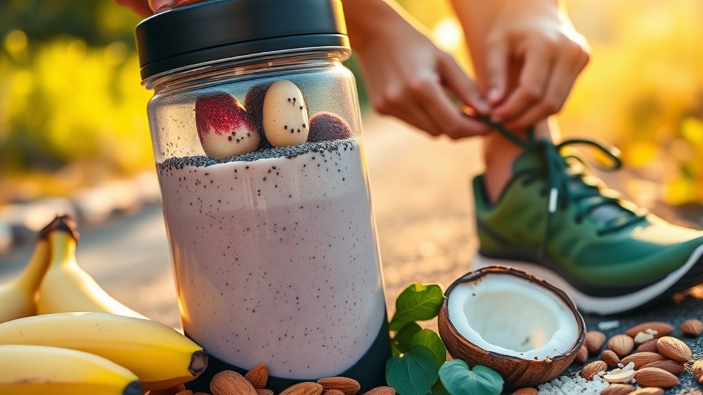 You’re in luck—ingredients like pea protein, hemp seeds, and chia seeds naturally boost muscle recovery. I’ve noticed that adding tart cherry extract and turmeric helps reduce soreness too. Including a splash of almond milk for extra hydration and a banana for potassium makes a big difference. These ingredients work together, surprisingly, to speed up muscle repair and reduce inflammation, making your shake a powerful post-run recovery tool.