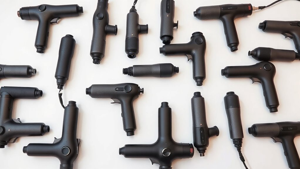 Have you considered how the variety of attachments can enhance your massage experience? Different massage heads target specific muscle groups and pain points more effectively. Interchangeable options like flat, bullet, and fork heads let you customize your treatment for deep tissue work, trigger points, or general relaxation. Specialized attachments can improve therapy results and address unique needs, such as sensitive areas or large muscles. When selecting a massage gun, durability and ease of cleaning are vital—most attachments are detachable and washable, ensuring hygiene. Compatibility and secure fitting of accessories also matter; they help maintain stability during use, which contributes to a quieter, smoother, and more efficient massage. Choosing the right attachments can truly elevate your overall experience.