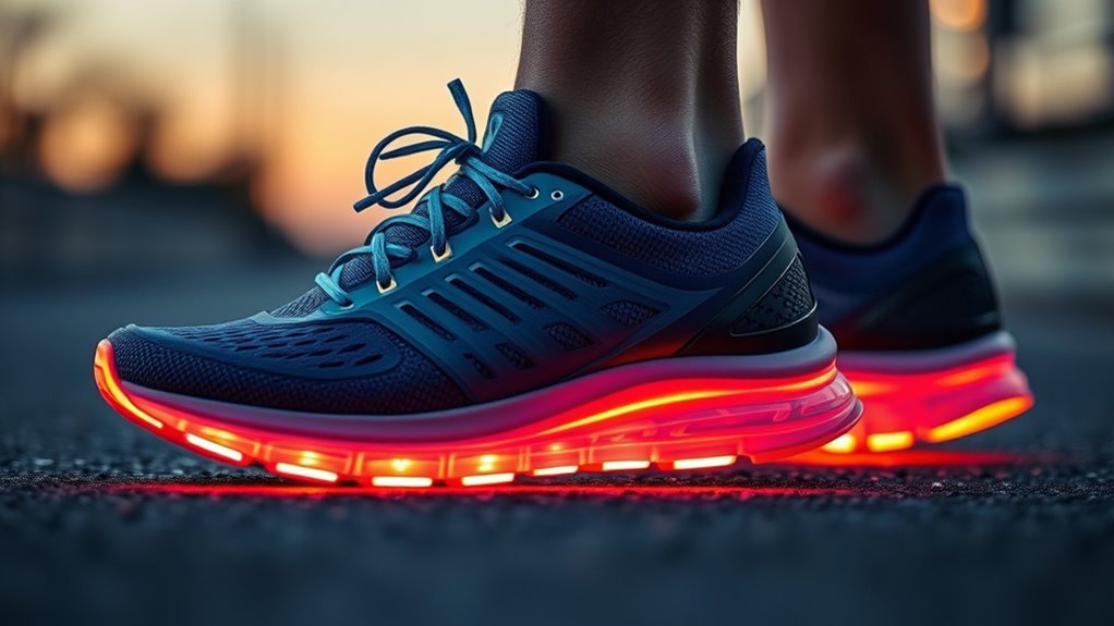 If you’re looking for the best reflective running shoes for safe night runs, I recommend options with high-visibility features like 360º tape, LED lights, and neon accents that enhance safety from all angles. Durable, weather-resistant materials and customizable fit options assure comfort and longevity. These shoes often come with rechargeable LED clips and reflective bands to keep you visible in low light. For a full list and insights, keep exploring to find the perfect match for your night runs.