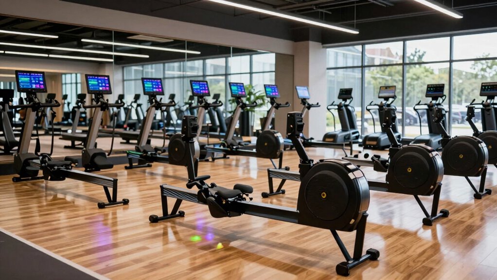When space is limited, selecting a rowing machine with a space-saving design becomes essential for effective interval training. These models usually feature foldable or compact frames that cut down the storage footprint by over 70%, making them perfect for small apartments or home gyms. Many come with built-in wheels or rollers, which make moving and repositioning easy without hassle. Vertical storage options allow you to tuck the machine upright against a wall or in a closet when not in use, saving even more space. Their slim profiles and minimal footprints ensure they fit comfortably into tight spaces without sacrificing functionality. Quick assembly and disassembly features also help keep clutter at bay, so you can set up and store your equipment efficiently, supporting frequent use without crowding your living area.