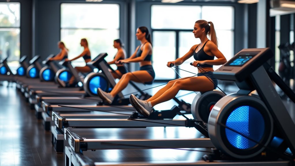 Imagine rowing through a peaceful lake; that’s how quiet these machines are. Most models emit minimal noise, often around 50-60 decibels, comparable to a soft conversation. I’ve used some that barely make a sound, even during intense sprints. So, if you value a silent workout or don’t want to disturb others, these rowing machines are a great choice—they keep the noise down while giving you a full-body burn.