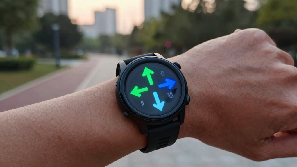 A high-quality display and intuitive interface are essential for a running watch with on-wrist navigation arrows, as they directly impact how easily you can read directions during your run. A sharp, high-resolution AMOLED screen, like 466×466 pixels, offers vibrant visuals and clear navigation cues, even in bright sunlight. An adaptive Always-On Display helps conserve battery while keeping essential directions visible at all times. Touchscreen sensitivity is critical for quick, accurate interaction with navigation arrows, especially when you’re on the move. Customizable watch faces and easily viewable interface elements improve readability in various lighting conditions, ensuring you can stay focused on your run. Brightness levels of 1000 nits or higher guarantee visibility outdoors, making navigation reliable regardless of where you run.