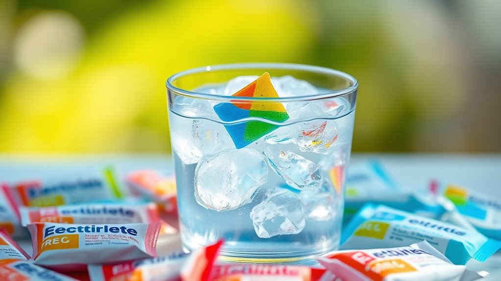 The speed at which electrolyte tablets dissolve can substantially impact your hydration routine, especially if you need a quick boost. Effervescent tablets generally dissolve faster than non-effervescent types because they contain agents like citric acid and bicarbonates, which release bubbles and gas, speeding up the process. Finer particle sizes and porous structures also help tablets dissolve more quickly, making hydration more efficient. Water temperature plays a role too—cold water slows down dissolution, while warmer water speeds it up. Additionally, tablet design matters; bisected or scored tablets dissolve faster than whole, unscored ones. If you’re in a hurry or want instant refreshment, choosing a tablet with these features can make a noticeable difference in how quickly you’re hydrated.