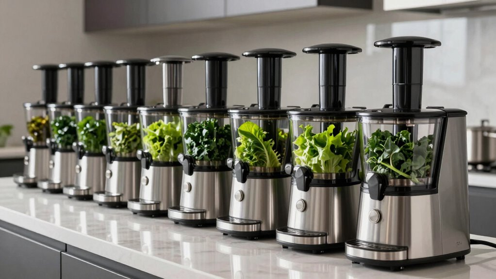 If you’re looking for the best slow juicers for leafy greens in 2026, I’ve found several top models that stand out for their efficiency, quiet operation, and user-friendly design. Many feature large feed chutes, high juice yields, and easy cleaning—perfect for nutritious smoothies and juices. From compact options to powerful machines, there’s something to suit every kitchen. Stay with me, and I’ll explain what makes these juicers ideal and how to choose the right one for your needs.