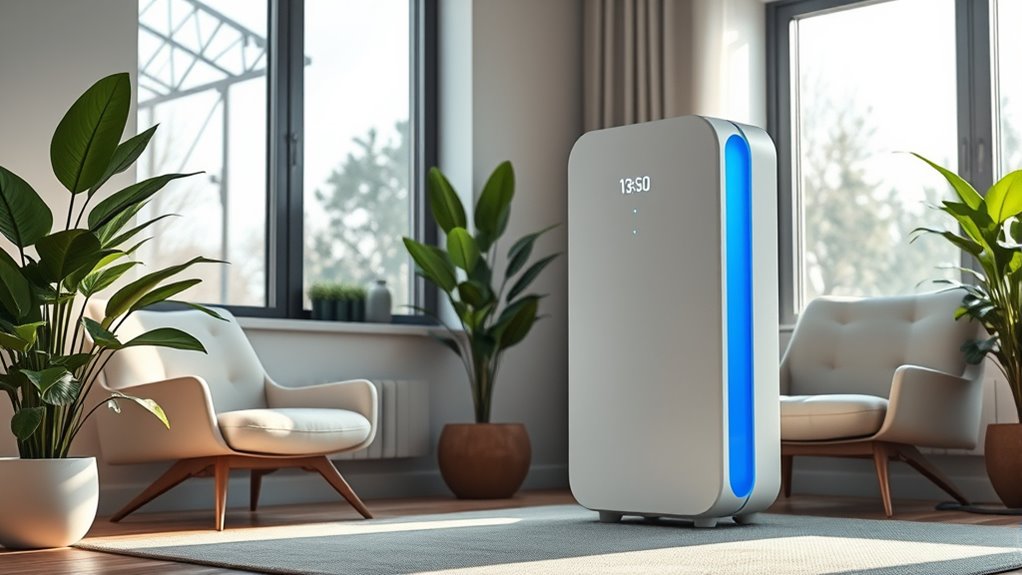 Smart air purifiers improve indoor air quality by actively monitoring and adjusting to real-time air conditions, unlike traditional models. I love how they connect to my phone, giving me instant updates and control from anywhere. They automatically optimize filtration, detect pollutants, and even filter out allergens more efficiently. This tech-savvy approach guarantees cleaner, healthier air, making my home safer and more comfortable without me having to lift a finger.