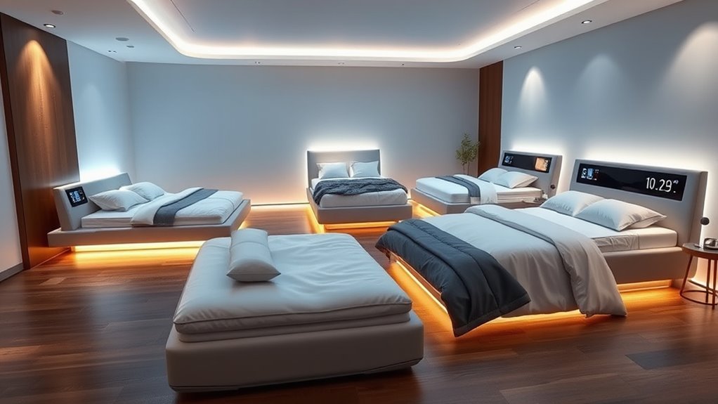 As I explore the world of smart beds and mattresses, it’s clear that the integrated features and controls can substantially enhance your sleep experience. Many models come with control systems that let you adjust firmness, temperature, and even massage settings through an app or touch panel. I love how sleep tracking sensors monitor my heart rate and breathing, optimizing my sleep quality. Automated controls allow for preset positions like zero gravity or anti-snore modes, activated with just a button press. Plus, voice command compatibility with Alexa or Google Assistant makes adjustments so easy. Some advanced models even regulate temperature based on my sleep stage or room conditions, ensuring I stay comfortable all night while being energy-efficient.