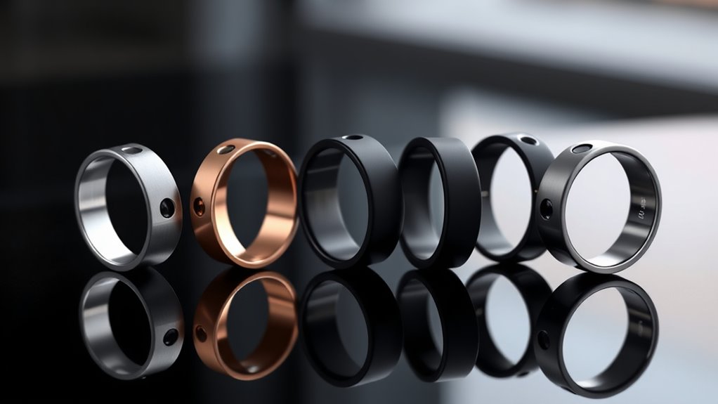 Have you ever wondered how your smart ring’s design influences both your style and comfort? The options are diverse, from sleek, minimalist designs to more decorative styles, so you can find something that fits your personality. Material choices like titanium, stainless steel, or resin not only enhance the look but also boost durability. Color options such as silver, black, gold, and rose gold make it easy to match your ring with your accessories and wardrobe. Some rings even support style switching through companion apps, allowing you to customize your look for different occasions. Fit is also essential; many rings offer adjustable sizing or kits to ensure comfort and accuracy without sacrificing style. Ultimately, your choice should blend functionality with your personal aesthetic.