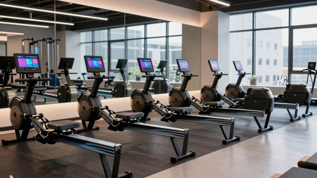 Choosing a smart rowing machine with the right resistance and workout options guarantees you get the most out of your training. Multiple resistance levels, like magnetic or electromagnetic systems, offer 16 to 130 pounds of resistance, ensuring suitable intensity for all fitness levels. Many models feature adjustable resistance that can be controlled digitally via apps or onboard controls, allowing seamless workout progressions. A variety of workout options, including programmed courses, interval training, and virtual environments, keep routines engaging and diverse. Some machines support automatic resistance adjustments during workouts, mimicking real-world rowing conditions and boosting effectiveness. Interactive features like games and coaching courses further expand workout possibilities, making sessions more motivating and versatile. These options help tailor your workout to meet your goals and preferences.