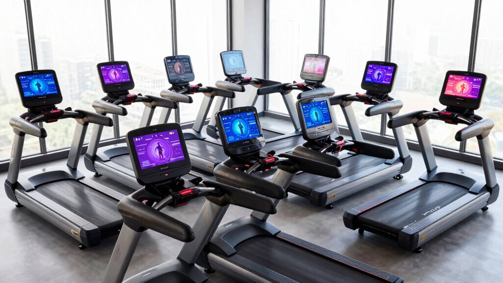 Think of touchscreen controls as the captain of a ship—safety features are the sturdy anchors holding everything steady. Yes, many smart treadmills include safety features like emergency stop buttons, automatic shut-off if you fall, and lockout functions to prevent accidental starts. These features act like a vigilant crew, ensuring your workout remains safe and secure, so you can focus on reaching your fitness goals without worry.