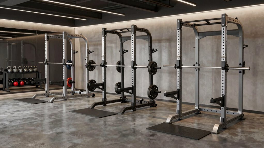 When selecting a squat rack for my garage gym, I focus on several key factors to guarantee it fits my space and workout needs. I consider the rack’s weight capacity, safety features, and how versatile it is for different exercises. Stability and construction quality also play a big role in making sure I choose a durable, reliable option.