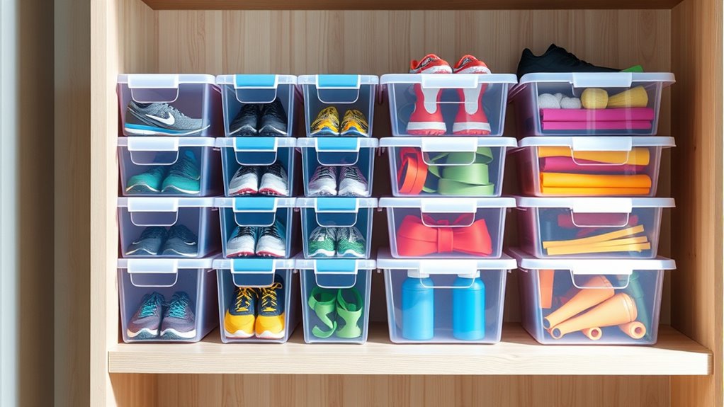 Yes, there are transparent stackable bins that make it easy to see your running accessories at a glance. I prefer these because I can quickly grab what I need without rummaging through opaque containers. They’re often made of durable clear plastic, so I can keep my space organized and efficient. Plus, their stackable design helps maximize storage without sacrificing visibility or accessibility.
