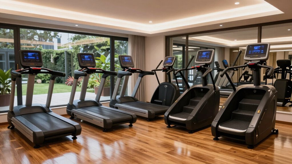 Workout personalization options markedly enhance the effectiveness of your stair climber sessions. Adjustable resistance levels and incline settings let me tailor workout intensity to my fitness level and goals. Programmable modes or preset programs help target specific areas, whether I want a fat-burning session or endurance building. Heart rate monitoring features and app integration provide real-time feedback, so I can modify my effort accordingly. Ergonomic adjustments, like handlebar height and pedal angle, ensure comfort and proper form during workouts. The ability to set specific durations, step counts, or calorie targets helps me stay focused and motivated. These customization options make each workout more personalized, effective, and engaging, helping me maximize my results while staying comfortable and safe.