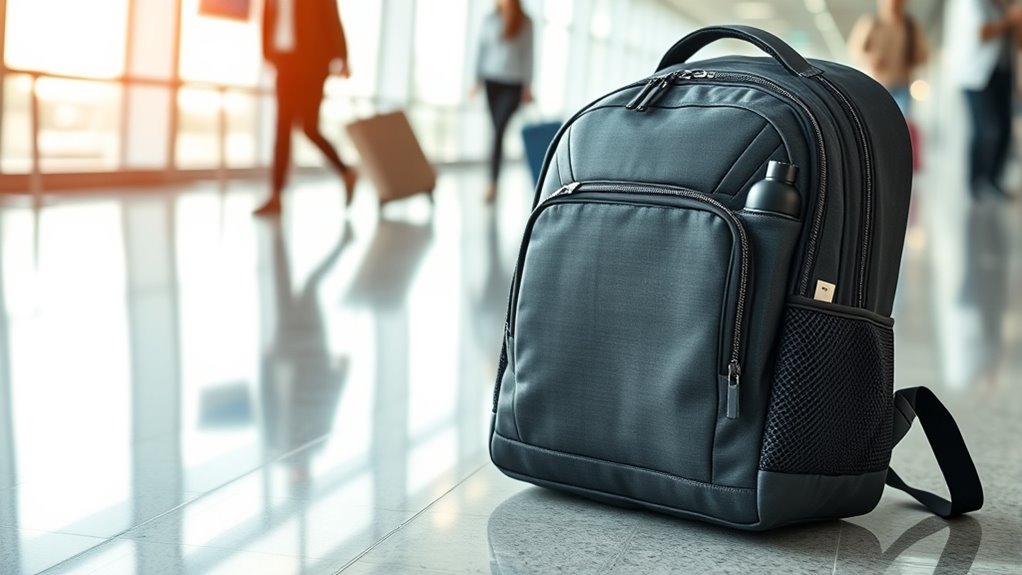 Security features are vital to protect my laptop and valuables while traveling, especially in crowded or unfamiliar places. I look for backpacks with built-in password locks or lockable zippers to secure my laptop compartment against theft. RFID-blocking pockets are also essential, preventing electronic pickpocketing of personal data stored on RFID chips. Inside, I prefer models with shockproof belts or straps to keep my device stable and protected during movement. A dedicated, padded laptop compartment that’s separate from other sections helps reduce damage and unauthorized access. Hidden zippers or anti-theft pockets are additional layers of security, safeguarding my valuables from pickpockets. These features give me peace of mind and ensure my belongings stay safe throughout my journey.