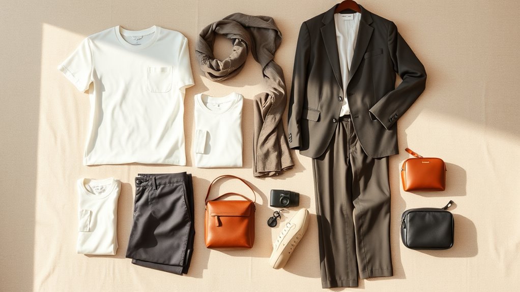 If you’re looking to simplify packing in 2025, I recommend choosing versatile pieces like compression cubes from TRIPPED Travel Gear, soft sweaters, and stylish bodysuits. Items like long-sleeve shirts, flowy tank tops, and easy-care fabrics help expand your wardrobe’s options without bulk. Mix and match to create stylish outfits that work for day and night. Keep going, and you’ll find more tips to build your perfect capsule wardrobe that makes travel stress-free.