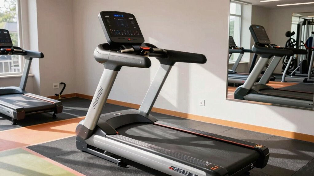 When adjusting the incline, I guarantee safety with features like automatic stop or emergency shut-off, which activate if I stumble or the incline isn’t stable. Most modern treadmills also have safety keys that instantly stop the machine if pulled. I always double-check the incline lock before starting, and some models offer soft-drop mechanisms to prevent sudden drops, giving me peace of mind during my workout.