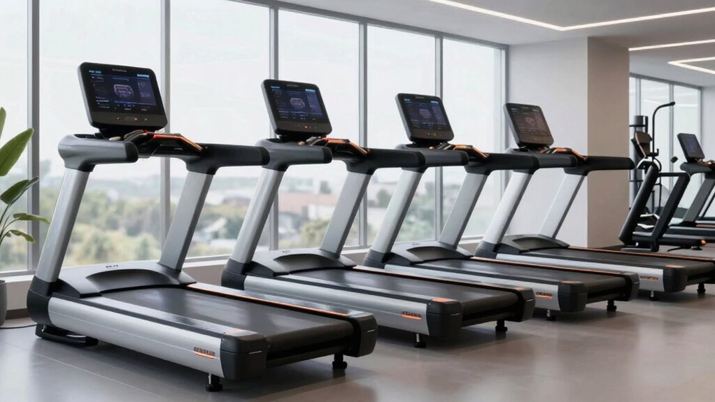 Think of a wide belt treadmill as a sturdy bridge over a rushing river — it needs safety features to prevent falls. These treadmills often include emergency stop buttons, safety keys, and side rails. I always check for these safety elements before running, because they act like guardrails, ensuring I stay secure. Just like a bridge, a well-equipped treadmill keeps you safe as you cross into your fitness journey.