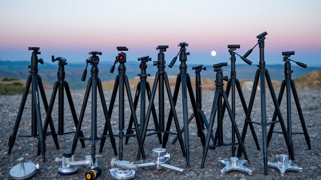 When choosing tripod materials for durability, I look for aluminum or carbon fiber. Aluminum is sturdy and affordable, handling most weather conditions well, but it can corrode if not treated. Carbon fiber is lightweight, strong, and resistant to temperature changes, making it ideal for tough environments. I also consider weatherproof coatings to prevent damage from rain or snow, ensuring my gear stays reliable during long astrophotography sessions.