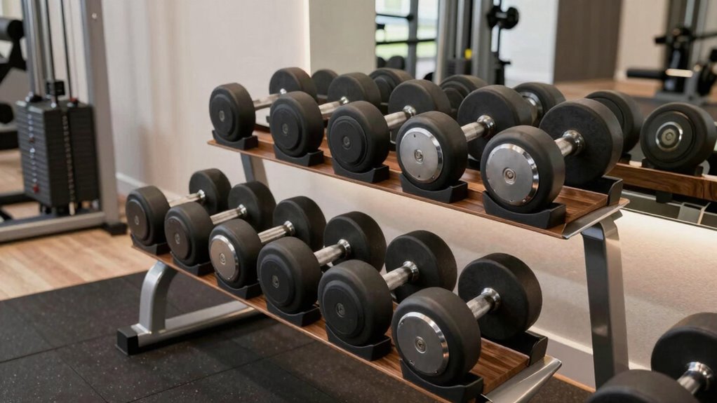 • Space-efficient storage racks with multiple tiers help organize dumbbells neatly and maximize home gym space.