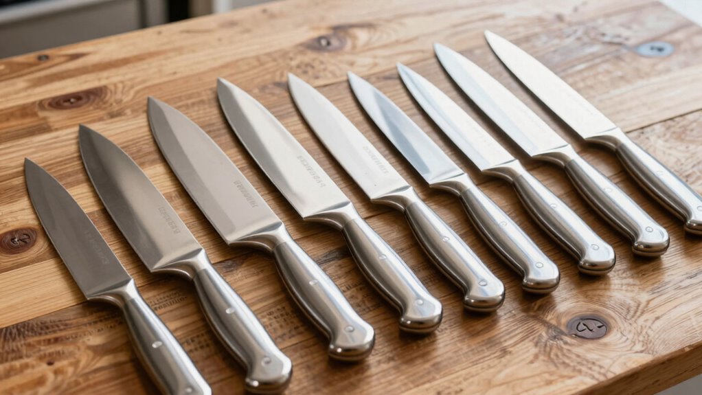 When selecting value kitchen knives, safety features should be a top priority to prevent accidents and guarantee ease of use. Blade guards, sheaths, and non-slip handles help minimize slips during storage and cutting tasks. Ergonomic handle designs reduce wrist strain and improve grip stability, lowering the risk of accidents. Color-coded sets are useful for preventing cross-contamination and quickly identifying tools. Full-tang construction and bolster protection enhance control and safety during slicing or chopping. Additionally, knives that are dishwasher-safe, paired with protective covers or sheaths, make cleaning and storage safer and more convenient. Prioritizing these safety features ensures that your kitchen remains a secure environment while making your cooking experience more comfortable and efficient.