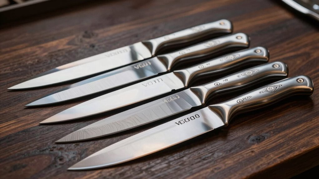 Think of VG10 knives like a trusty steed—robust enough for a professional’s daily rides and refined for home chefs’ culinary journeys. I find they’re perfect for both, offering sharpness, durability, and precision. Whether you’re slicing veggies in a busy kitchen or preparing a weekend feast, VG10 blades handle it all with grace. They’re versatile and reliable, making them an excellent choice whether you’re a pro or cooking at home.
