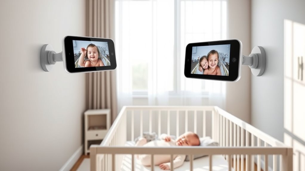 Choosing a baby monitor with dual cameras means paying close attention to video quality to guarantee you get a clear and reliable view of your little one. High-resolution video, like 1080p or higher, ensures sharper images with fine details, making monitoring more accurate. Advanced night vision technology provides crisp infrared images in low light, so you can see clearly without disturbing sleep. Features such as optical and digital zoom allow closer inspection of specific areas, enhancing clarity. Stable, lag-free streaming, supported by strong wireless connections and high frame rates like 25 fps, ensures smooth video feeds. Proper calibration and quality sensors are essential to prevent blurriness, pixelation, or distortion, helping you maintain consistent, clear visuals of your baby at all times.