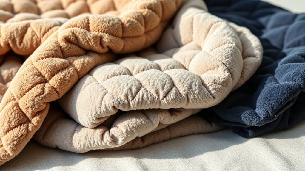 Breathability plays a essential role in guaranteeing your weighted blanket remains comfortable during use, especially when anxiety can make you more sensitive to discomfort. A breathable blanket helps prevent overheating, which can lead to sweating and restlessness. Materials like cotton, bamboo, and breathable polyester fabrics promote airflow and moisture-wicking, keeping you cool and dry. Some blankets feature multiple layers or specialized ventilation to enhance breathability and regulate temperature more effectively. Using weight-fillings like glass beads designed for airflow further reduces heat retention. Proper breathability levels are fundamental for improving sleep quality, as they help minimize sweating and discomfort during those anxious moments. Choosing a blanket with good airflow ensures you stay comfortable, relaxed, and better able to unwind.